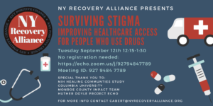 Join the New York Recovery Alliance on Tuesday September 12th from 12:15-1:30 during Huther Doyle’s Project ECHO for a presentation and discussion about improving health equity for people living with Substance Use Disorder and people who use drugs.